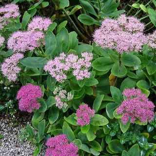 小さな赤紫〜ピンクの花をたくさんつけた花序を秋に咲かせる多肉植物。花は茎の頂点に咲かせるのでよく目立ち、花つきも良好です。葉は多肉質で葉縁のギザギザが特徴です、全体が粉が吹いたように薄っすら白くみえます。毎年地下茎で増え横に広がります。冬の間は地上部は枯れる宿根草です。