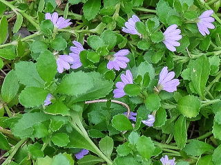 扇や天狗のうちわのような独特な形の花。紫〜青紫色の花色が涼しげな印象ですが暑さには強いです。