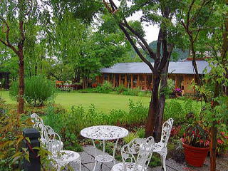小道から樹幹越しに芝庭と庭を見ながら食事ができる洋食レストランが見えます。寄せ植えや小物類も美しく管理されて綺麗です