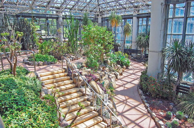 立派な観賞植物園の外観。温室内部はサボテン温室と大温室の2つのエリアに分かれており、小規模ながらも展示内容はまとまっています。