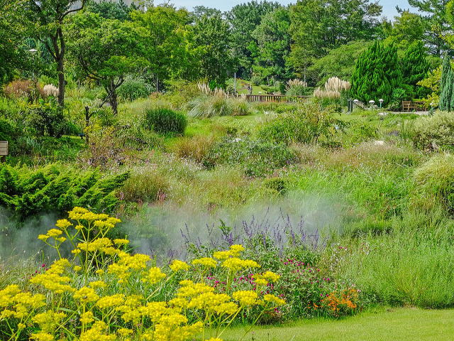 愛知県の名古屋港にある、やや狭いながらも日本屈指の美しい自然風庭園。正式名称は「名古屋港ワイルドフラワーガーデンブルーボネット」。毎年楽しめる低木や多年草と、華やかな一年草や球根植物を適度に織り交ぜて植栽することで、春から秋にかけて常に花を絶やさない工夫が見られます。