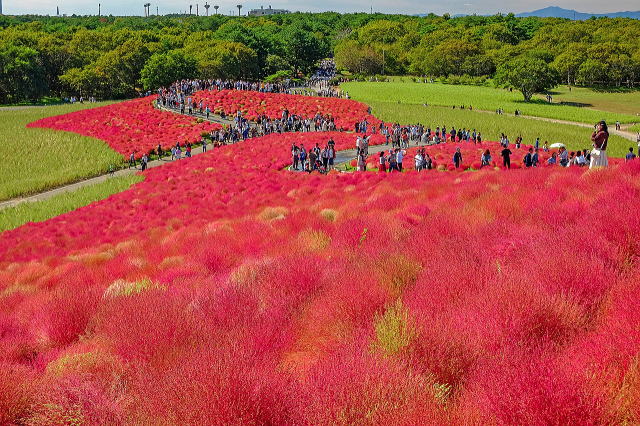 10月中旬から10月下旬はみはらしの丘がコキアの紅葉で赤く染まります。同時にコスモスやソバ、ススキなどの花も楽しめます。この時期もネモフィラほどではありませんが混雑が激しいです