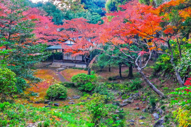 茶室の東側にある小路から見た景色。新緑や紅葉時は見ごたえがあるので、ぜひ立ち寄りましょう。