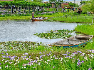 水路が縦横にある水郷の雰囲気が再現されています。園内を巡る舟も含め、他のハナショウブの名所とは異なる個性があります。