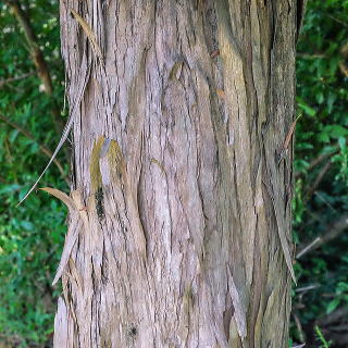 イヌマキの幹。老木になると表面が薄く縦に裂けて、次第にはがれてきます。