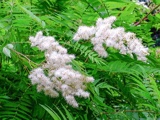 花は穂のような花序になり、小さな白い小花をたくさんつけます。長く伸びる雄しべが特徴。梅雨のころに咲きますが、夏以降にも断続的に花を咲かせます。葉は羽状複葉で小葉は7〜11対、葉縁の鋸歯が目立ちます。樹形はブッシュ状に枝を伸ばし、自然と分枝します